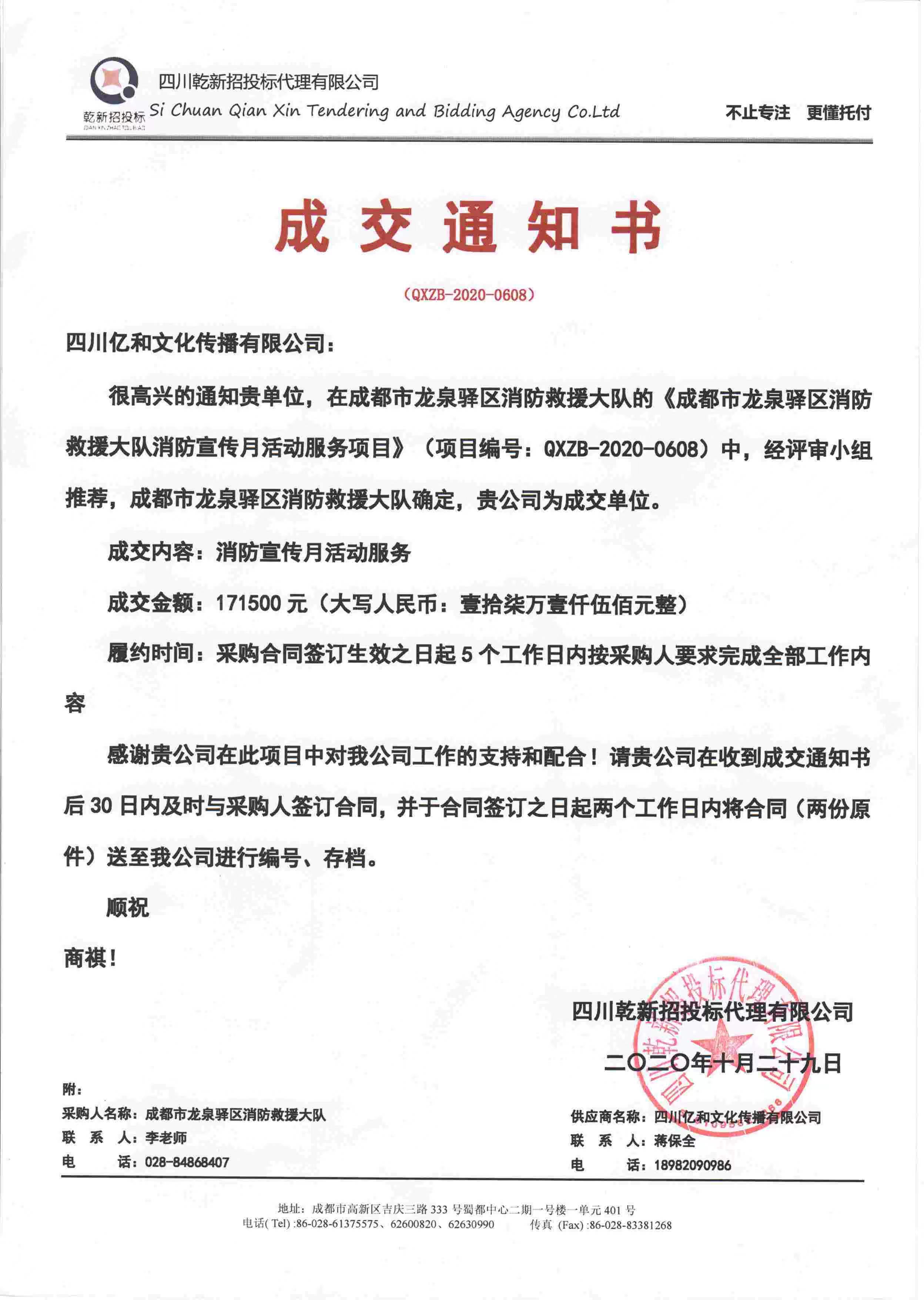 【喜訊】公(gōng)司中(zhōng)标2020年“成都市龍泉驿區(qū)消防救援大隊消防宣傳月活動服務(wù)項目”!