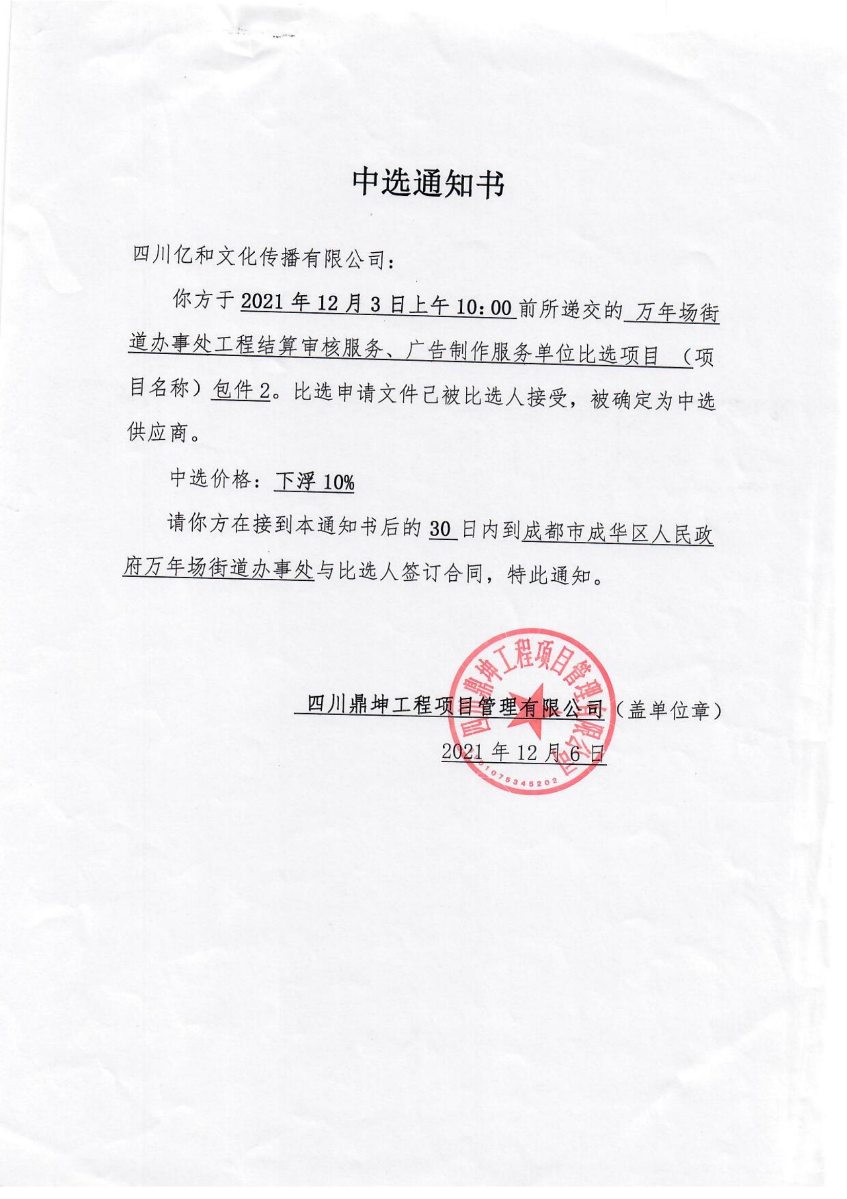 【喜訊】公(gōng)司中(zhōng)标2021年“成都市成華區(qū)萬年場街(jiē)道辦(bàn)事處工(gōng)程結算審核服務(wù)、廣告制作(zuò)服務(wù)單位比選項目”!